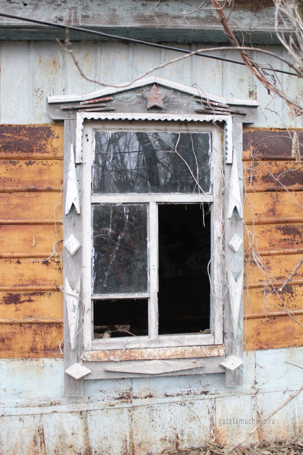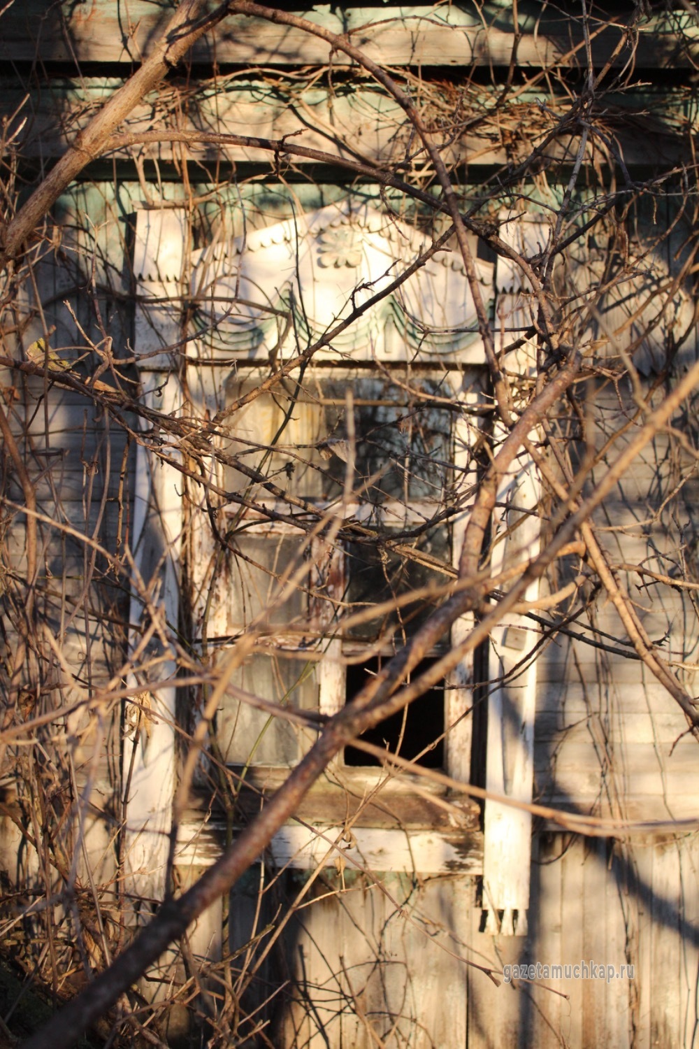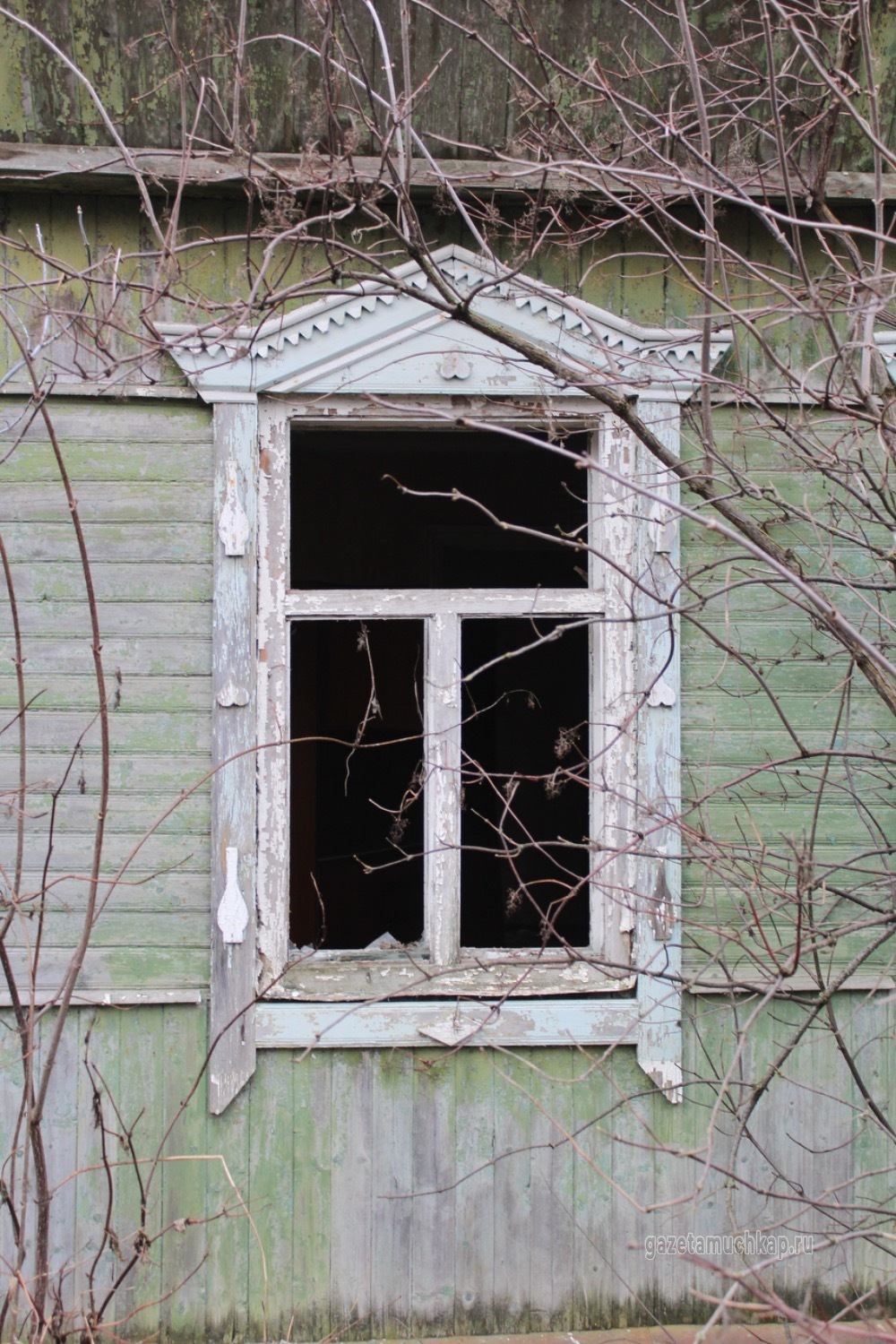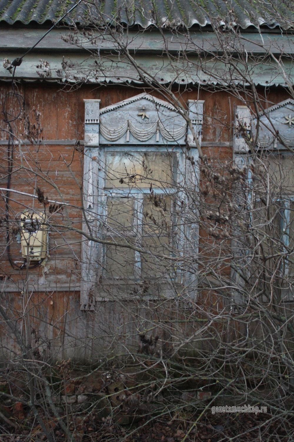 Среди этого запустения чудом уцелели всего два наличника. Они висят на окнах покинутых домов — обшарпанные и потрескавшиеся, почти без краски. Сейчас они просто молчаливо смотрят на то, как деревня медленно угасает.