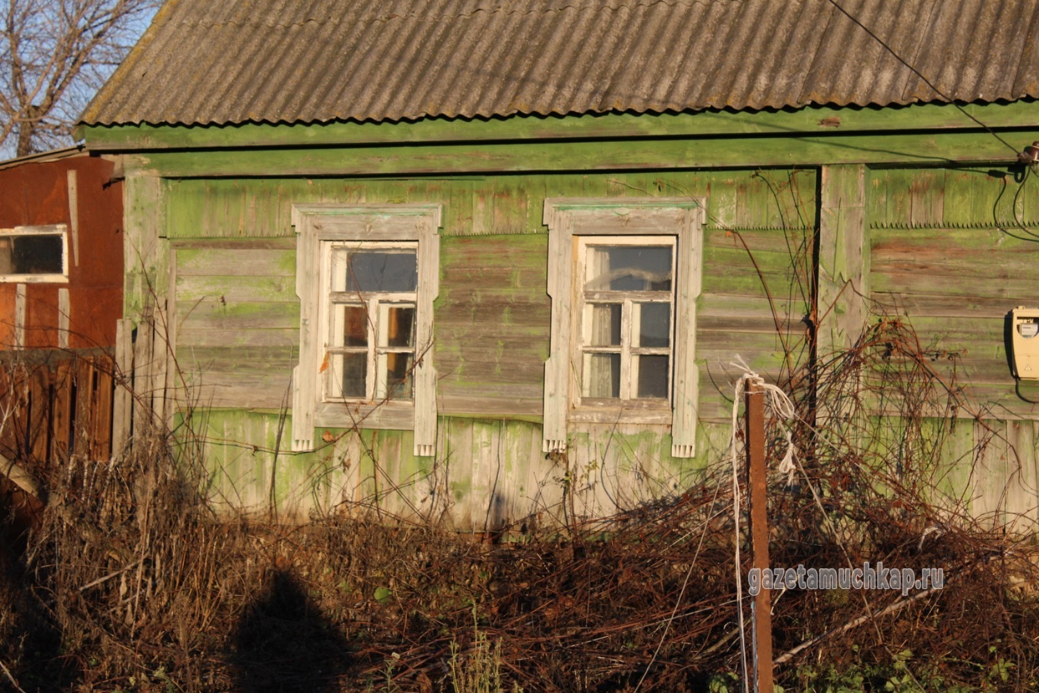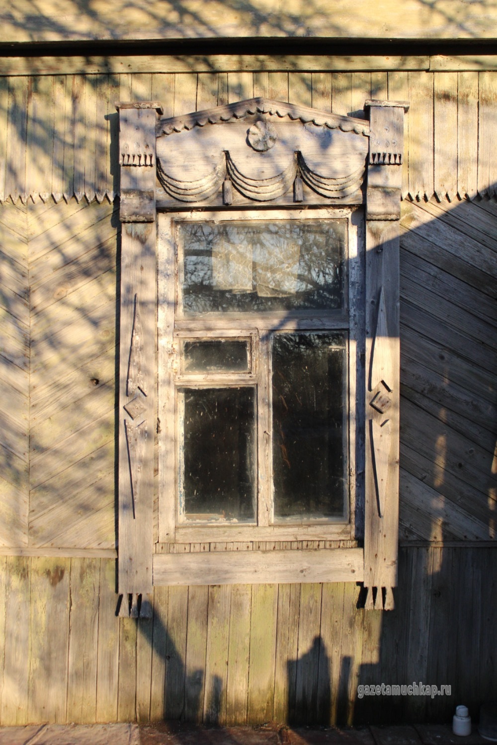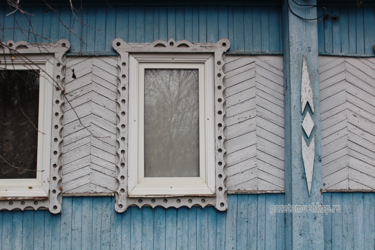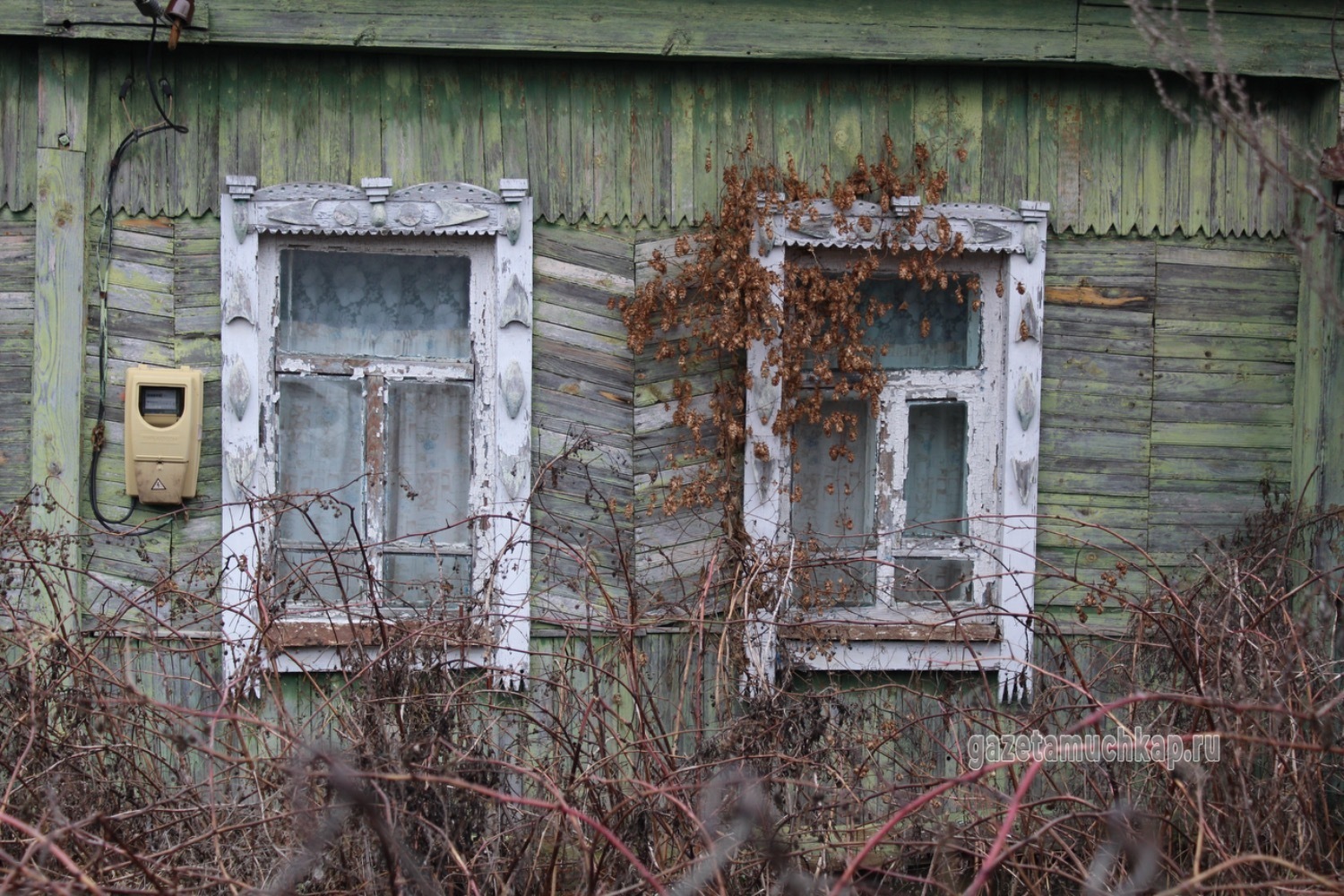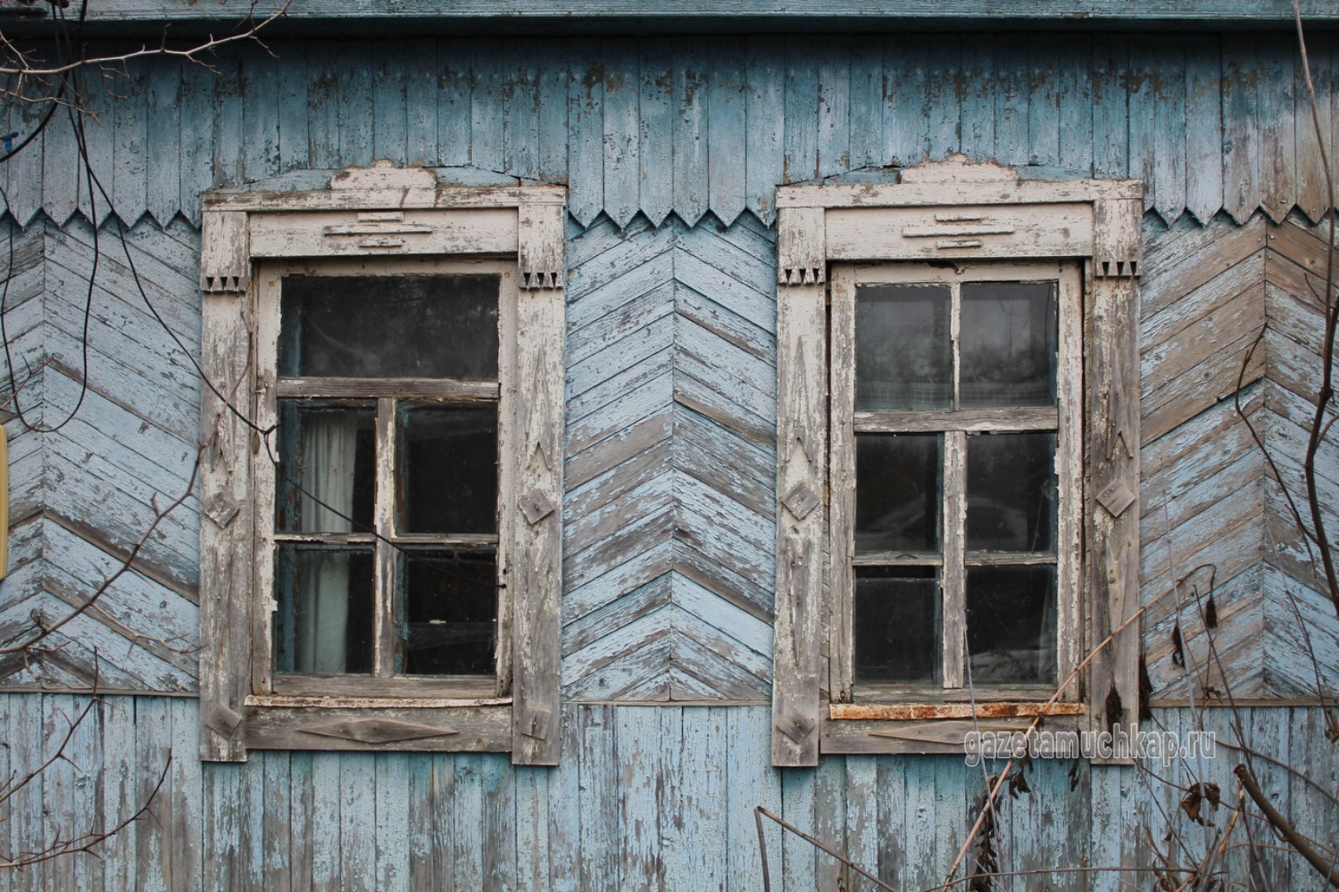 Среди этого запустения чудом уцелели всего два наличника. Они висят на окнах покинутых домов — обшарпанные и потрескавшиеся, почти без краски. Сейчас они просто молчаливо смотрят на то, как деревня медленно угасает.