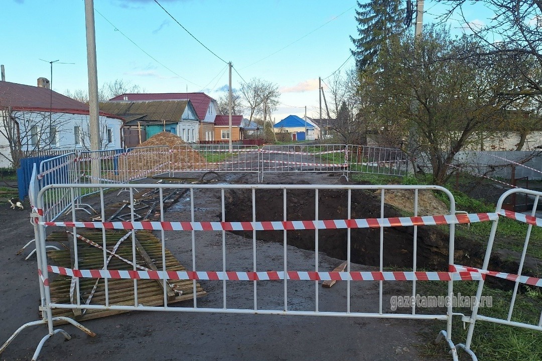 Масштаб проблемы впечатляет. Дорога по улице перекрыта. Котлован огорожен для безопасности пешеходов и водителей.