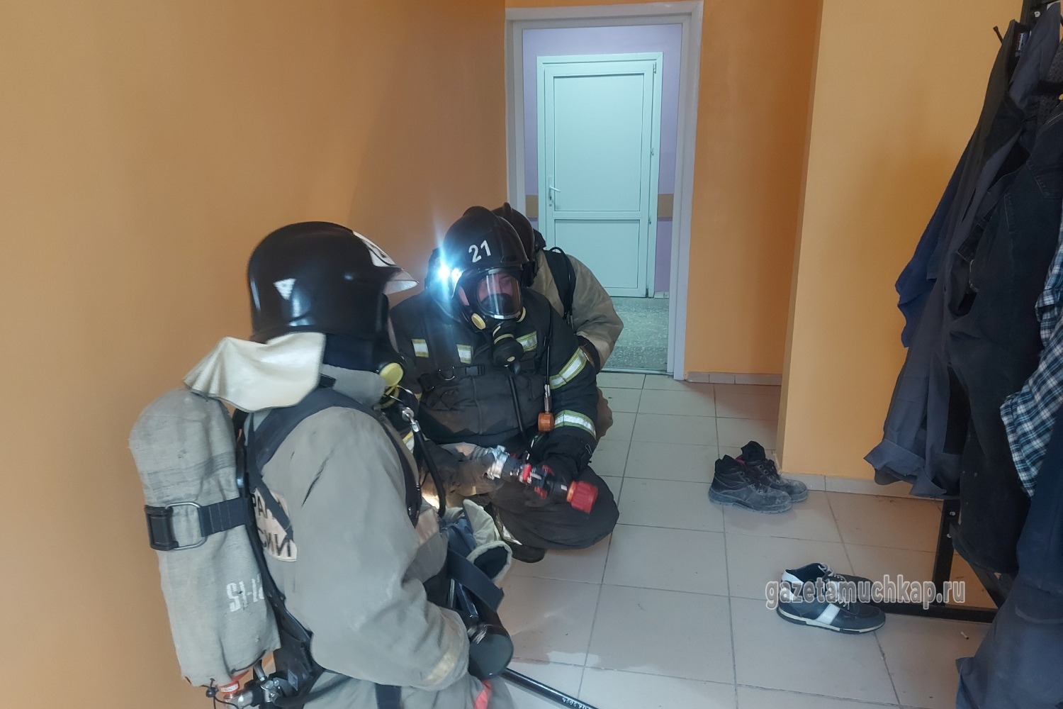В 4-этажном здании больницы звучит пожарная сигнализация. Автоматически сигнал подаётся на пульт дежурного диспетчера ПСЧ №21, но и телефоный звонок из больницы никто не отменял. А пожарные уже бросились одеваться. На это им даётся две минуты, в течение которых они должны выехать в полном обмундировании.