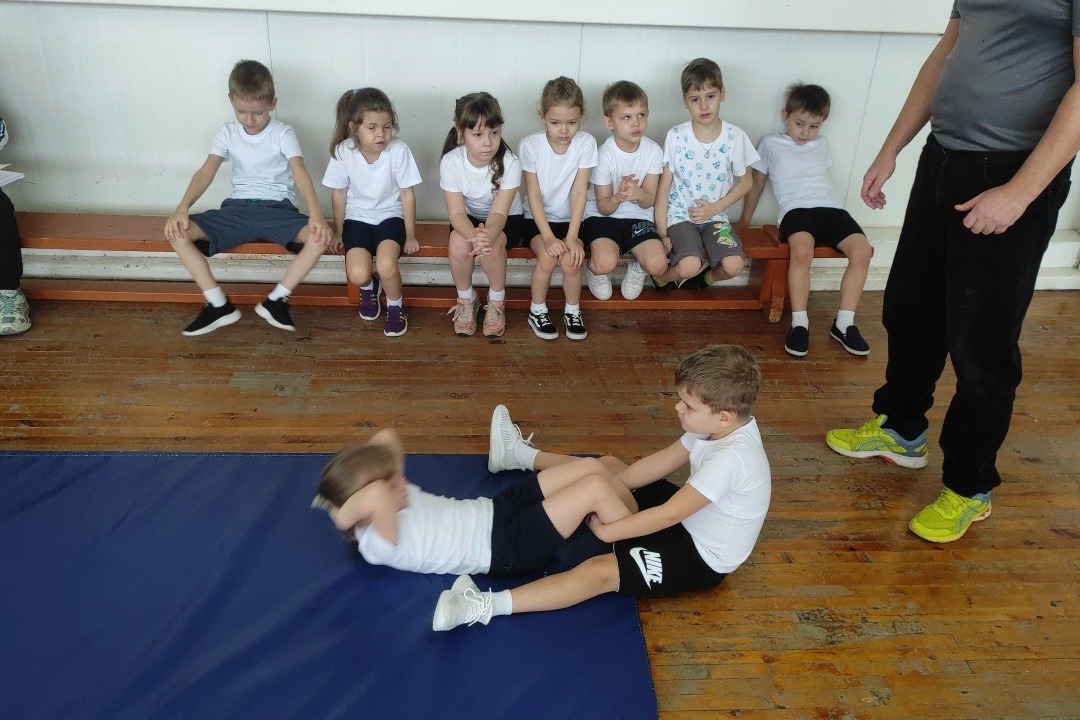 Далее девчонки и мальчишки выполнили нормативы I ступени комплекса (6-7 лет) бег на 10 и 30 метров, прыжок в длину, наклон вперёд из положения стоя на гимнастической скамье, челночный бег и поднимание туловища из положения лёжа на спине.